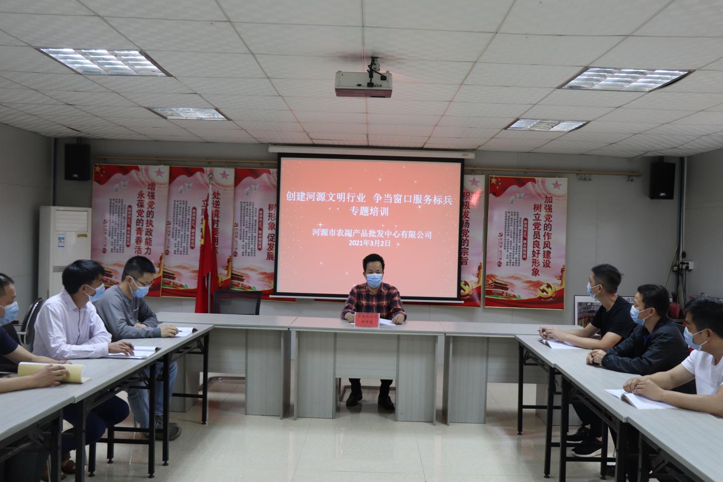 河源市農(nóng)副產(chǎn)品批發(fā)中心有限公司積極響應河源市文明委關于開展文明行業(yè)創(chuàng)建的號召,于2021年3月2日在公司會議室開展“創(chuàng)建河源文明行業(yè),爭當窗口服務標兵”專題培訓,市農(nóng)批中心三鳥交易區(qū)(三鳥市場)的窗口服務人員全部參加了培訓。